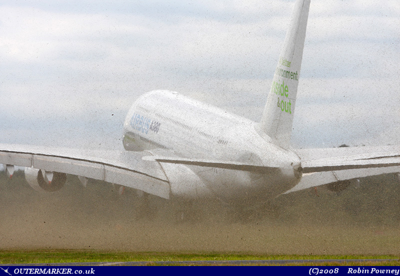 In what is probably a first for me at a UK show, I heard and saw people clapping and cheering when it landed – not quite so much as Paris 2007, but nevertheless, whether it’s because it was a fine performance from the A380 or because people have come to a conclusion that the program is a success, clapping and cheering is clapping and cheering. However, as if the relatively staid and restrained Airbus house colours weren’t bad enough, the jet at Farnborough had its tail redecorated with “A better environment inside and out” on one side with “Airbus A380 See the bigger picture” on the other and large “recyclable by design” stickers on the forward fuselage – boring doesn’t go anywhere near covering it; not to mention it seems to me to be a little ironic. A maximum take off weight of half a small African nation with engines capable of reversing continental drift and it’s supposed to be “green”? Hmmm. Please, please, please Airbus, ignore the tree-hugging eco-warriors and send an A380 in full airline livery to Farnborough 2010 as, though I’m no airline expert, I don’t imagine that the top brass of, say, British Airways had recyclable at the top of priorities when it came to ordering the titan from Toulouse. Fuel burn and efficiency? I’ll give you that one… the fact that you can chop an A380 up in thirty years time and make an untold number of kitchen utensils out of it, I doubt it. |